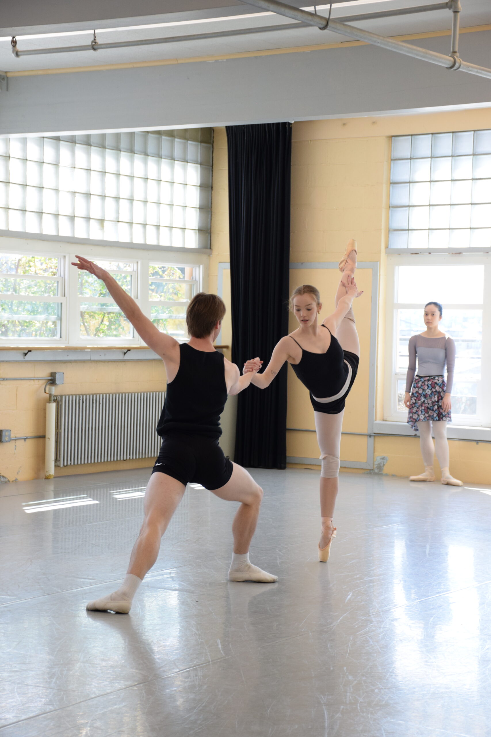 OBT trainee Kirsten Rye as Lise and former OBS student Yevgeni Gorboulev as Colas rehearsing the Pas de Deux from La Fille Mal Gardée. Photo by Hadley Kaufmann.